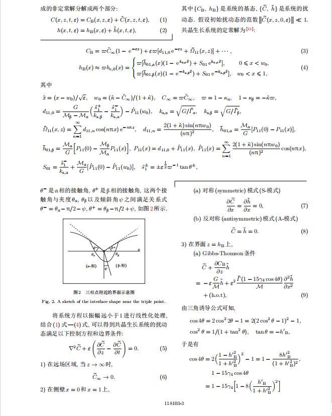 為考察共晶生長形態(tài)穩(wěn)定性,利用共晶生長的定常解作為基態(tài)進(jìn)行穩(wěn)定性分析.在初始時刻t=0時對基態(tài)解做一小擾動,并將在t>0以后形成的非定常解分解成兩個部分: