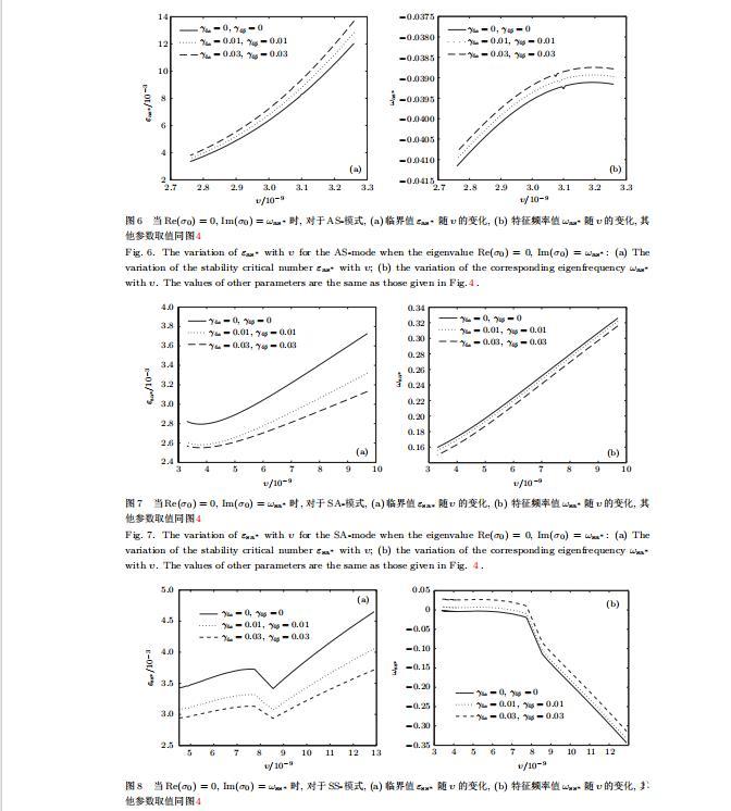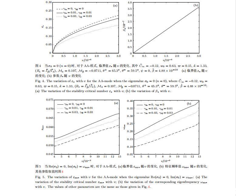 給定生長條件,令量子化條件(59)式、(64)式、(69)式和(74)式中Re(σ0)=0,Im(σ0)=ω?=0,用數值的方法計算AA-,AS-,SA-和SS-模式對應的穩定臨界值εaa?,εas?,εsa?和εss?.這四種振蕩不穩定模式導致了所謂的全局不穩定性機理,圖5—圖8給出了四種震蕩不穩定模式的穩定臨界值εaa?,εas?,εsa?和εss?隨著υ的變化圖.從圖5、圖7和圖8可以看出,隨著各向異性表面張力系數增大,穩定臨界值εaa?,εsa?和εss?隨之減小.這就意味著各向異性表面張力減小片層共晶生長的穩定性區域,增強了AA-,SA-和SS-這三種全局震蕩模式的全局不穩定性;然而,對于AS-全局震蕩模式而言,從圖6可以看出,隨著各向異性表面張力系數增大,穩定臨界值εas?隨之增大.這就意味著,各向異性表面張力增大片層共晶生長的穩定性區域,減弱了AS-全局震蕩模式的全局不穩定性.