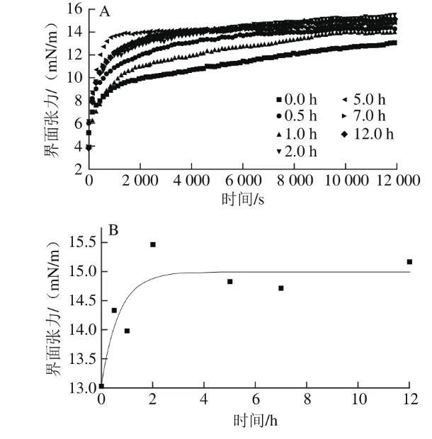 圖3纖維化過程中β-乳球蛋白在油水界面的吸附動力學(xué)過程(A)及其飽和界面張力(B)的變化