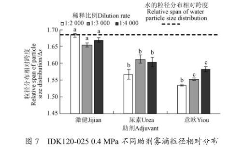 3)IDK120-025型噴頭,0.4 MPa壓力下。激健在配比1:3 000條件下,相比于自來水霧滴體積中徑增大20.43%,霧滴粒徑相對分布跨度減小1.74%。尿素與意歐溶液在配比1:2 000條件下,相比于自來水霧滴體積中徑分別增大16.92%、11.10%,霧滴粒徑相對分布跨度分別減小6.92%、8.86%,在增大霧滴體積中徑的同時有效改善霧滴分布質量,增大霧滴飄移可控性。