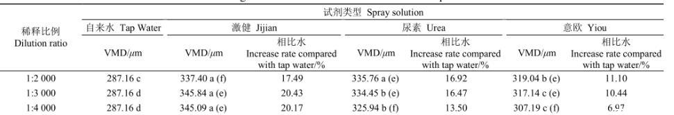 表3為霧滴體積中徑試驗結果,結果顯示,與水相比,3種助劑均呈現增大霧滴體積中徑趨勢。激健助劑在1:2 000稀釋比例下溶液與其余2種配比溶液之間存在顯著性差異。尿素與意歐助劑在1:4 000稀釋比例下溶液與其余2種配比溶液之間對應存在顯著性差異。此結果說明,3種助劑在與水混合后霧化效果相對穩(wěn)定。不同稀釋比例下,激健溶液與水相比霧滴體積中徑增大17%~20%,尿素溶液增大13%~17%,意歐溶液增大7%~11%。尿素與意歐溶液對霧滴體積中徑影響均呈現隨溶液濃度降低影響效果減弱趨勢。
