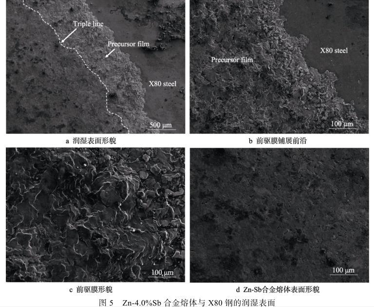 綜上分析,Zn-Sb合金熔體潤濕X80鋼時,Sb作為表面活性元素在鋅液表面富集,使其在界面反應過程中降低鋅液表面張力,從而提高潤濕性。在鋅合金熔體與X80鋼的反應三相線外形成前驅膜,前驅膜的存在使隨后的鋅合金熔體在其上鋪展,進而促進潤濕。