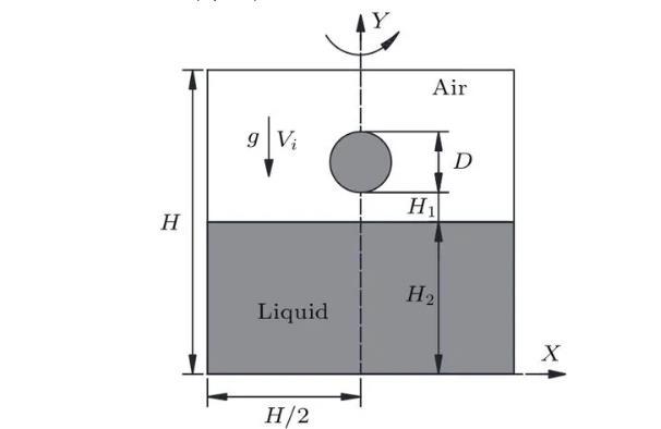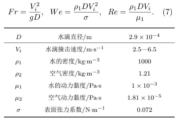如圖1所示,水滴撞擊深水液池的數值模擬在軸對稱坐標系中進行,Y軸為計算區(qū)域的對稱軸,D為初始水滴直徑,R=D/2,正方形計算區(qū)域的長度H=20D,水滴距離液面的距離H1=0.1D,液池深度H2=12D以消除底部對液滴撞擊運動的影響,水滴在重力g和撞擊速度Vi的作用下撞擊液池。采用雷諾數、韋伯數和弗勞德數來描述液滴撞擊的運動特征,三者分別表征液體慣性力與黏滯力間的關系、液體慣性力與表面張力間的關系以及液體慣性力與重力間的關系。三個無量綱參數的表達式如(7)式所示,主要物理參數如表1所列。
