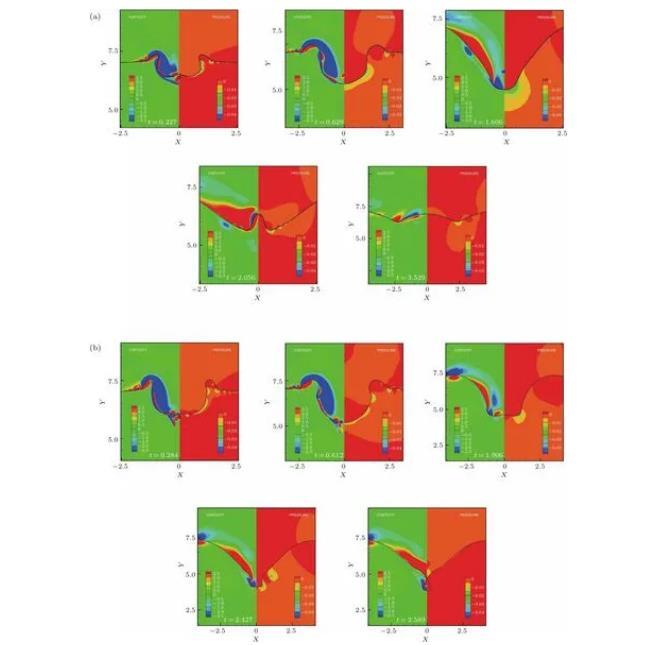 圖9不同時(shí)間節(jié)點(diǎn)下水滴撞擊深水液池空腔運(yùn)動(dòng)的渦量場(chǎng)和壓力場(chǎng)等值線圖