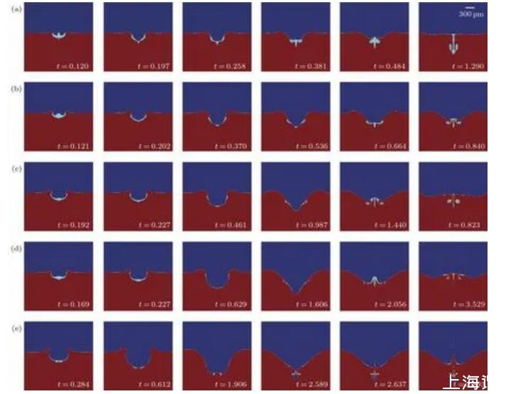 上述水滴撞擊水池的過程可以歸納為三個(gè)基本階段,第一階段為空腔的形成與膨脹;第二階段為毛細(xì)波傳播導(dǎo)致的空腔收縮;第三階段為空腔的回復(fù)。液滴撞擊深水液池時(shí)的運(yùn)動(dòng)分為完全聚結(jié)與部分聚結(jié)現(xiàn)象,在水滴與深水液池完全聚結(jié)時(shí),水滴入水時(shí)由于水滴底部發(fā)生凹陷變形產(chǎn)生的氣泡夾帶隨著撞擊速度的增加而減小,而在部分聚結(jié)發(fā)生時(shí)氣泡的夾帶與截留行為則更為復(fù)雜。