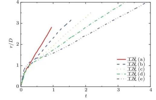 圖7及圖8分別為不同工況下波浪隆起高度hw和空腔寬度r隨時(shí)間的變化過程。由圖7易得,水滴撞擊水池后波浪高度的變化過程也經(jīng)歷了從快速增長(zhǎng)到逐漸回落,最終在慣性力的作用下自主運(yùn)動(dòng),趨于穩(wěn)定的過程。隨著弗勞德數(shù)的增大,更大的垂向速度在創(chuàng)造更深空腔的同時(shí)激發(fā)了更高的最大波浪隆起高度。從圖8可以看出,空腔寬度的增長(zhǎng)與波浪的運(yùn)動(dòng)息息相關(guān),在撞擊產(chǎn)生的動(dòng)能與波浪自身重力勢(shì)能基本耗散后,空腔運(yùn)動(dòng)主要由毛細(xì)波及其干擾驅(qū)動(dòng),最后在慣性下線性增長(zhǎng)。毛細(xì)波現(xiàn)象在圖8工況(e)的t=0.8時(shí)非常顯著,其周期在圖6的t=1.5—2.5中也有體現(xiàn)。