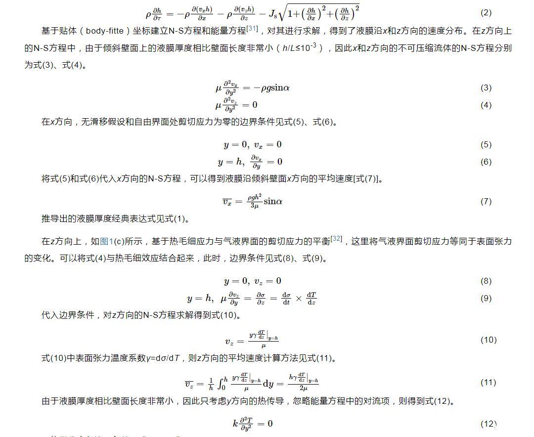 式(1)將作為本文模型計算的迭代初值。之后,Kapitza首次對傾斜平板上流動液膜的流體動力學不穩(wěn)定性進行了研究,對流動液膜的流動不穩(wěn)定性和破裂有了初步的認識。隨著實驗方法和測量技術(shù)的不斷進步,研究人員通過更高效的實驗和模擬方法對流動液膜進行了深入和廣泛的研究,深化了對液膜流動模式、流動特性和蒸發(fā)等內(nèi)在機制的理解,也為相關(guān)的工業(yè)應用提供了重要的科學依據(jù)。