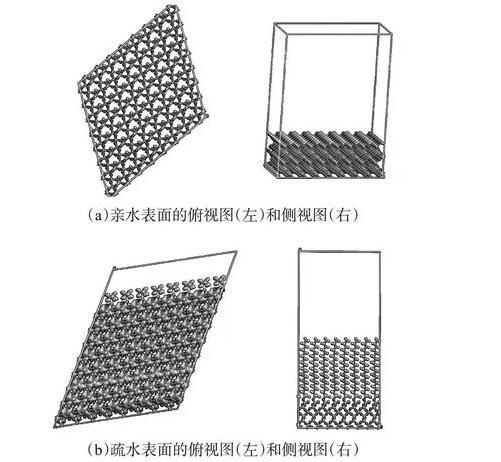 SiO2(001)元胞表面羥基化后,用十八烷基三氯硅烷(OTS)取代羥基進行硅烷化處理,并通過構建超胞得到擴展表面。為消除周期邊界條件的影響,在表面添加35?真空層,得到SiO2疏水表面初始模型。優化后的疏水表面結構如圖1(b)所示,OTS的長鏈烷基在表面呈輕微傾斜的垂直規律排布。