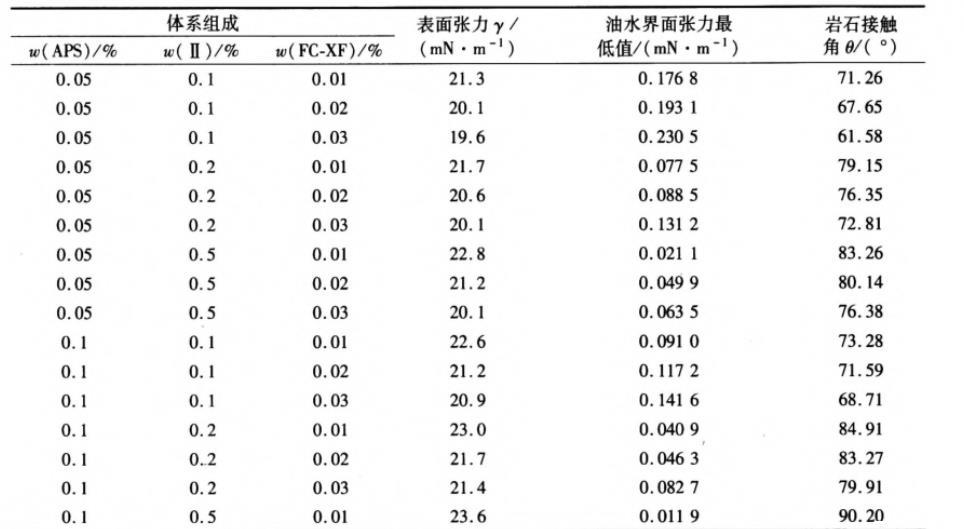 表1體系組成和含量對APS/Ⅱ/FC-XF混合體系界面性能的影響