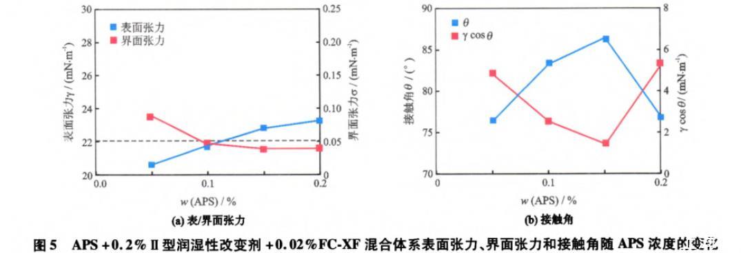 從圖5(a)中可以看出,隨著APS質(zhì)量分?jǐn)?shù)的增加,體系的表面張力增大,界面張力減小,這與FXCF對表/界面張力的影響機制相同。從圖5(b)中可以看出,隨著APS質(zhì)量分?jǐn)?shù)的增加,體系與巖石的接觸角先增加再減小,相應(yīng)的γcosθ先減小再增大,均出現(xiàn)極值點,這與圖4(b)的變化趨勢不同。這是因為吸附Ⅱ型潤濕性改變劑和FC-XF使得巖石表面由水濕轉(zhuǎn)變?yōu)槿跤H水性潤濕(接觸角<75°),更易于吸附APS的親水頭基而使碳氫鏈在巖石表面暴露,這降低了巖石表面的親水性,因而隨著APS質(zhì)量分?jǐn)?shù)的增加接觸角增大。但是,當(dāng)APS質(zhì)量分?jǐn)?shù)大于0.15%后,過多的APS分子可能在巖石表面發(fā)生雙分子層吸附或因競爭吸附而降低Ⅱ型潤濕性改變劑的吸附量,使得巖石表面的親水性增加。而且,接觸角的變化決定了γcosθ的變化趨勢,因而接觸角和γcosθ隨APS質(zhì)量分?jǐn)?shù)的變化曲線中均出現(xiàn)極值點。
