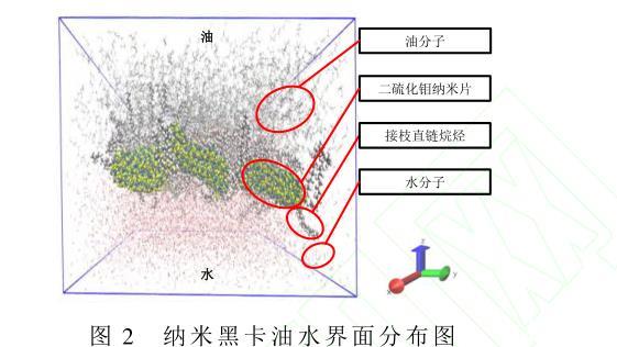 計(jì)算水分子、油相分子和納米黑卡之間的相互作用,截?cái)喟霃椒謩e為10?和12?。所構(gòu)建的油水界面體系由31 500個(gè)油分子和17693個(gè)水分子組成,并將納米黑卡置于所構(gòu)建的油水界面體系中。如圖2所示,油水界面上層部分的碳?xì)滏湵硎居头肿樱退缑嫦聦訁^(qū)域代表水分子。