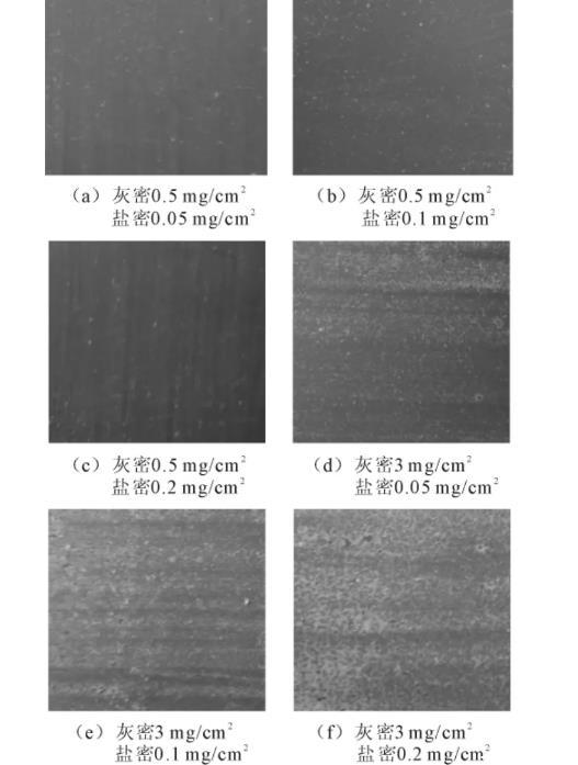 憎水角測量所用的硅橡膠試片的尺寸為100 mm×100 mm×5 mm。試驗中為了保證試片處于相同環(huán)境中,用清水對試片進(jìn)行清洗,并用酒精擦拭后用無紡布擦干。本試驗中的涂污方式采用固體層法中的定量涂刷法,根據(jù)IEC規(guī)程中的污層分級設(shè)置,選用灰密為0.5、3mg/cm2,鹽密值選用0.05、0.1、0.2 mg/cm2,分別代表污穢程度為“中、重、非常重”的污穢等級。涂污之前先進(jìn)行打灰處理,再將污液均勻涂抹在試片上。將涂污后的試片和潔凈試片放入相同環(huán)境中,如圖2所示。