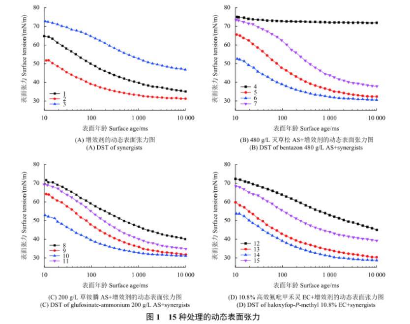 圖1 15種處理的動態(tài)表面張力