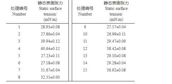 1.2.1靜態(tài)表面張力測定參照文獻方法測定。在(25±1)℃下,用0.3 mm的鉑金環(huán)(外徑20.30 mm,周長61.89 mm,密度0.998 g/mL)在全自動張力儀上先用純水進行校準,然后測定表1中15種處理的靜態(tài)表面張力,每個試驗至少重復(fù)3次,結(jié)果取平均值,用Origin Pro軟件(9.0版,OriginLab公司)處理數(shù)據(jù)。