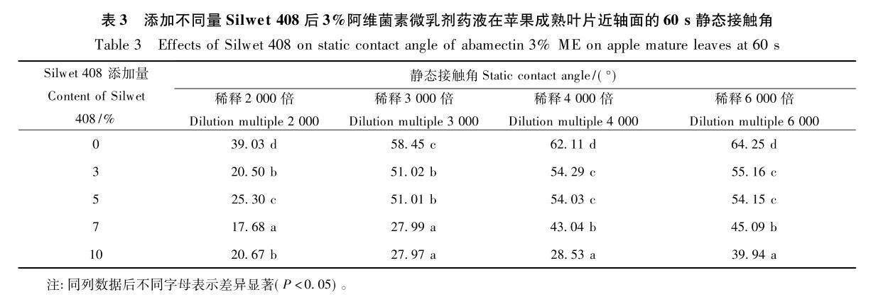2.2添加不同量Silwet 408對阿維菌素微乳劑藥液在蘋果嫩葉片上靜態接觸角的影響