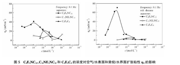 圖5是工作頻率為0.1 Hz時,C8E4NC12、C12NE3NC12和C8E4C8的表、界面擴張粘性隨濃度的變化趨勢。從圖中可以看出,與擴張彈性類似,表面擴張粘性隨濃度的變化也通過一個極大值。C8E4NC12的表面擴張粘性最大,C8E4C8次之,C12NE3NC12最低。C8E4NC12的界面擴張粘性略高于表面,而C8E4C8和C12NE3NC12的界面擴張粘性則遠低于表面。