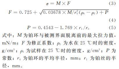 式中:M為鉑環與被測界面脫離前的最大拉力值,mN/m;F為修正系數;rho_0為水在25℃時的密度,g/cm3;rho_1為試樣在25℃時的密度,g/cm3;P為常數;r_0為鉑環的平均半徑,mm;r_1為鉑絲的半徑,mm。