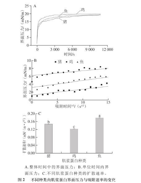 由圖2可知,不同種類肌漿蛋白的動力學擴散速率間存在差異性。蛋白質分子在界面上的擴散速率受其粒徑大小的影響,而本實驗結果更能解釋這一現(xiàn)象。在前述理化指標中,粒徑大小為雞肉肌漿蛋白>豬肉肌漿蛋白>魚肉肌漿蛋白,而在本部分擴散速率大小為雞肉肌漿蛋白<豬肉肌漿蛋白<魚肉肌漿蛋白。這可能是由于大粒徑的肌漿蛋白產(chǎn)生的空間位阻在一定程度上削弱了表面疏水性提高帶來的吸附速率增加。而且魚肉肌漿蛋白的擴散速率較豬肉和雞肉肌漿蛋白間顯著較大(P<0.05),但雞肉與豬肉肌漿蛋白之間的擴散速率卻無顯著性差異(P>0.05)。