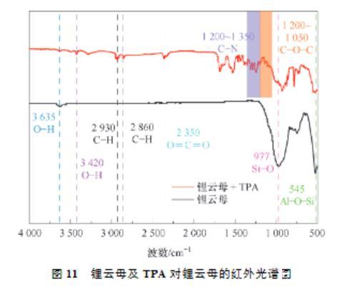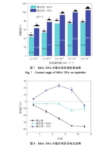 (2)接觸角試驗表明,同等條件下,TPA作用鋰云母的接觸角總是大于DDA,展現了TPA更強的疏水性。Zeta電位測試結果表明,TPA及DDA在鋰云母表面的吸附為靜電吸附,并且碳鏈更長的TPA由于疏水效應吸附性更好,進一步證明了TPA的強疏水性。FTIR及XPS進一步證實了TPA吸附在鋰云母表面。