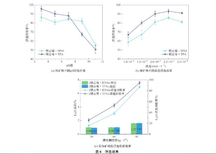 由圖6(b)可以看出,在捕收劑濃度為1.0×10??~3.0×10??mol/L時,DDA或TPA對鋰云母的浮選回收率均隨捕收劑濃度的增加而增大,如TPA濃度為1.0×10??mol/L時,對鋰云母的浮選回收率為66.89%,當TPA濃度為2.5×10??mol/L時,浮選回收率為92.99%。當捕收劑濃度達到2.5×10??mol/L后,浮選回收率不再隨著捕收劑濃度的增大而增高。此外,TPA對鋰云母的浮選回收率在捕收劑用量為30~90 g/t時均高于DDA。