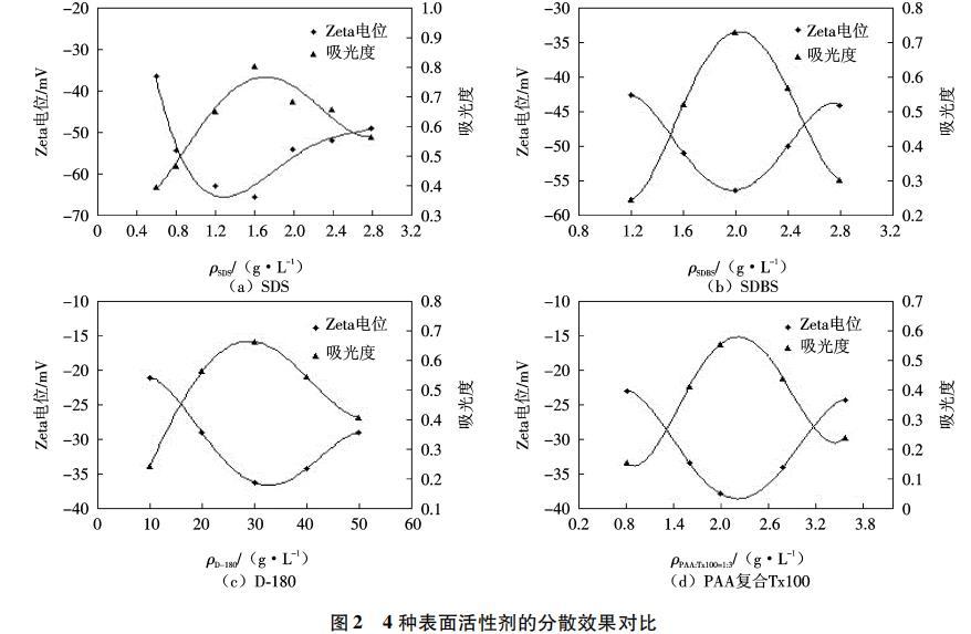 表面活性劑超聲分散法制備CNFs懸浮液的過程如下:量取55mL蒸餾水,分別溶解不同濃度的SDS、PAA復合Tx100(質量比為1:3)、D-180和SDBS,取出5mL表面活性劑溶液,稀釋至20mL,用作紫外/可見分光光度計測試時的參比溶液.分別稱取0.01gCNFs溶于剩余50mL分散劑溶液中,機械攪拌10min,超聲分散15min,得到CNFs懸浮液.