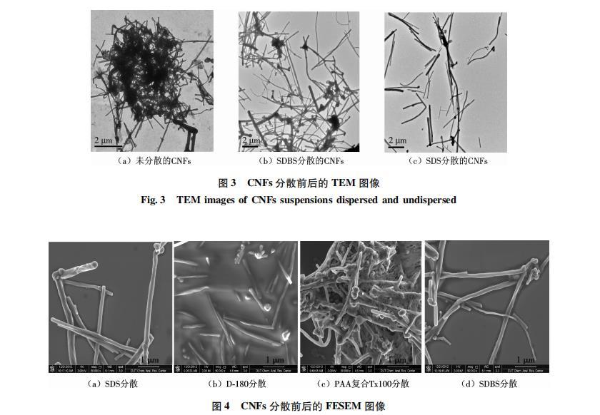 (2)TEM下觀察SDS與SDBS分散的CNFs懸浮液,可以看到CNFs纏結現象明顯得到改善,可觀察到單根CNF存在,SDS對CNFs的分散效果強于SDBS.