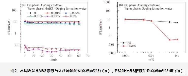圖2不同含量HABS溶液與大慶原油的動態界面張力(a),PS和HABS溶液的穩態界面張力值(b)