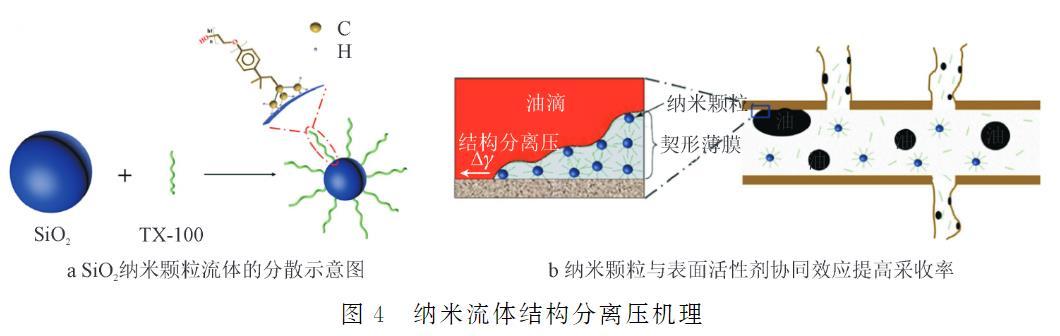 WasanD等提出的“結(jié)構(gòu)分離壓”理論,解釋了納米流體在油-固界面時(shí)這種壓力作用將油膜或油滴從巖石表面分離的過程。通過進(jìn)一步的研究發(fā)現(xiàn),這種結(jié)構(gòu)分離壓力的大小和速度受到納米顆粒濃度和液滴體積的影響。ZHAO等以非離子表面活性劑(TX-100)作為分散劑和增效劑,將SiO2納米顆粒分散在水中形成SiO2納米流體(如圖4a所示),并對SiO2納米流體剝離固體表面油滴的能力進(jìn)行了探究。SiO2納米流體和表面活性劑(TX-100)均具有將油滴從巖石表面脫離的能力。與表面活性劑(TX-100)相比,當(dāng)添加SiO2納米顆粒時(shí),納米流體可以在油/固體/納米流體三相接觸區(qū)形成薄膜從而產(chǎn)生結(jié)構(gòu)分離壓,將油滴從巖石表面剝離。由于表面活性劑天然剝離油滴的能力和SiO2納米顆粒的結(jié)構(gòu)分離壓力機(jī)理(如圖4b所示),SiO2納米流體具有優(yōu)秀的滲吸提高采收率能力。