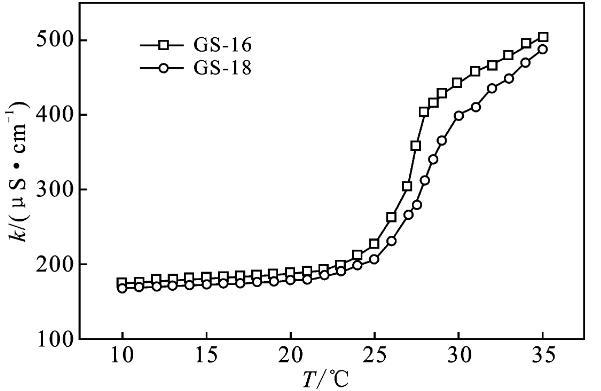 2.2.1 Krafft溫度Krafft溫度影響表面活性劑溶解度,表面活性劑在此溫度以上可以形成膠束。在Krafft溫度以下,以單分散的表面活性劑與水化固體表面活性劑的狀態存在,而在Krafft溫度以上,水化固體表面活性劑的溶解和膠束形成也參與了平衡[9-10]。質量分數1%表面活性劑GS-12,在室溫可以完全溶解,將其溶液置于冰水混合物中1周,溶液仍然澄清透明,沒有渾濁的跡象。表明GS-12的Krafft溫度低于0℃。通過測量電導率可以得到Krafft溫度的近似值,由圖3可知,GS-16,GS-18的Krafft溫度分別為27,27.5℃。k值在較低溫度下緩慢增加,這是由于離子表面活性劑的溶解度有限。隨著溫度的進一步升高,Krafft溫度處的k值急劇增加。k值的增加是由于膠束的形成,水合表面活性劑的溶解度突然增加,直至達到克拉夫特溫度。此外,離子遷移率增加隨著溫度增加、k逐漸增加[3,10]。結果表明,Gemini表面活性劑的Krafft溫度隨表面活性劑的疏水鏈長的增加而升高。