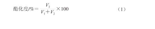 稱取100 mg不同脫酯果膠溶解于30 mL去離子水中,攪拌過夜。滴定前向果膠溶液中滴加3滴酚酞作為指示劑,用0.1 mol/L氫氧化鈉滴定液將果膠溶液滴定至顏色變為粉紅色,記錄消耗的滴定液體積V1。向體系中加入10 mL 0.1 mol/L氫氧化鈉溶液,脫酯15 min后,再加入10 mL 0.1 mol/L鹽酸溶液。然后用0.1 mol/L氫氧化鈉滴定液滴定體系中過量的鹽酸,直至顏色變為粉紅色,記錄滴定液消耗量(V2)。按式(1)計算果膠酯化度:
