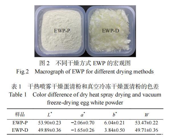 如圖2所示,EWP-P為細(xì)膩的鵝黃色顆粒粉末,EWP-D為松散的黃色片狀物。EWP-P的L*、a*和b*值分別為53.90±0.23、?2.06±0.70和6.04±0.21。EWP-D的L*、a*和b*值分別為49.89±0.36、?1.65±0.26和3.84±0.50(表1)。EWP-P的b*值較大是因?yàn)榈扒宓鞍字械钠咸烟窃趪婌F干燥過程中與蛋白發(fā)生了美拉德反應(yīng)。此外,真空冷凍干燥需將樣品進(jìn)行冷凍預(yù)處理,冷凍過程中,蛋清蛋白會(huì)發(fā)生褐變反應(yīng),故EWP-D最終呈現(xiàn)出的顏色較EWP-P黃(圖2)。EWP-P的顏色較EWP-D白(圖2),可能是因?yàn)楦蔁釃婌F干燥的干燥速度快,蛋清中的蛋白質(zhì)受熱時(shí)間短。因此在本實(shí)驗(yàn)干燥條件下,干熱噴霧干燥所得的蛋清蛋白粉更亮、更白,易被消費(fèi)者接受。