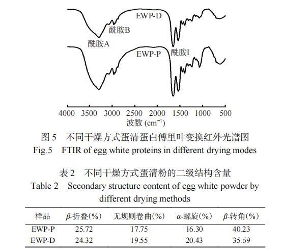 不同干燥方式蛋清蛋白的紅外光譜如圖5所示。EWP-P和EWP-D在酰胺A帶(3700~3200 cm?1)處有強(qiáng)吸收峰,EWP-P的峰強(qiáng)大于EWP-D,表明干燥方式會(huì)影響蛋清蛋白的水合能力,這可能與蛋白質(zhì)分子中N-H鍵舒展并與氫鍵形成了締合體,或蛋白質(zhì)分子與葡萄糖以共價(jià)鍵結(jié)合有關(guān)。酰胺B帶(2961.64 cm?1)的弱吸收峰主要由C-N鍵產(chǎn)生。酰胺I帶(1600~1700 cm?1)信號(hào)主要由C-O鍵伸縮振動(dòng)引起,與蛋白質(zhì)的二級(jí)結(jié)構(gòu)有關(guān),涉及β-折疊(1600~1640 cm?1)、無規(guī)則卷曲(1640~1650 cm?1)、α-螺旋(1650~1660 cm?1)和β-轉(zhuǎn)角(1660~1700 cm?1)。采用Peak fit軟件對(duì)不同干燥方式蛋清蛋白的酰胺I帶峰強(qiáng)進(jìn)行高斯曲線擬合分析,根據(jù)峰面積計(jì)算其二級(jí)結(jié)構(gòu)的相對(duì)百分含量,結(jié)果如表2。EWP-P和EWP-D的二級(jí)結(jié)構(gòu)以β-折疊和β-轉(zhuǎn)角為主,EWP-P的β-折疊含量增加主要與卵轉(zhuǎn)鐵蛋白熱變性有關(guān),同時(shí)分子間的β-折疊結(jié)構(gòu)也易轉(zhuǎn)變?yōu)棣?轉(zhuǎn)角結(jié)構(gòu)。而α-螺旋下降可能是因?yàn)闊嶙冃詫?dǎo)致α-螺旋中的氫鍵斷裂,進(jìn)而發(fā)生了解螺旋現(xiàn)象。EWP-P無規(guī)則卷曲增加,表明其部分有序結(jié)構(gòu)向無規(guī)則卷曲轉(zhuǎn)化,蛋白變性明顯,結(jié)構(gòu)的隨機(jī)性增強(qiáng)。