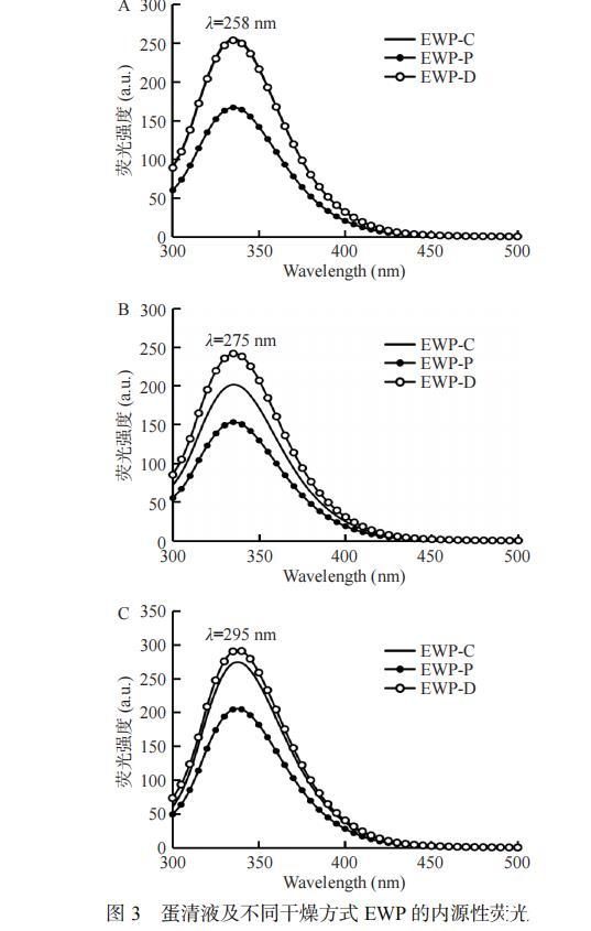 蛋白質(zhì)的固有熒光來自于內(nèi)部的芳香族氨基殘基(酪氨酸Tyr、色氨酸Trp、苯丙氨酸Phe),其熒光最大值(λmax)、強(qiáng)度對(duì)其微環(huán)境的極性極其敏感,因此可用來表征蛋白質(zhì)的三級(jí)結(jié)構(gòu)變化,其中Trp、Tyr和Phe的特有熒光激發(fā)波長(zhǎng)分別為295、275和258 nm。如圖3所示,與EWP-C相比,不同干燥方式制備的蛋清粉的固有熒光強(qiáng)度降低但熒光峰的位置未有明顯的遷移。EWP-P的熒光強(qiáng)度低于EWP-D于EWP-C,可能是因?yàn)閲婌F干燥的干燥溫度高,蛋清蛋白變性程度大,芳香族氨基酸殘基暴露于更極性環(huán)境中,進(jìn)而發(fā)生了熒光猝滅現(xiàn)象。此外,EWP-P的熒光強(qiáng)度較低還可能是由于蛋清蛋白中含有葡萄糖,在高溫下會(huì)與蛋白質(zhì)發(fā)生美拉德反應(yīng),屏蔽了芳香族氨基殘基。