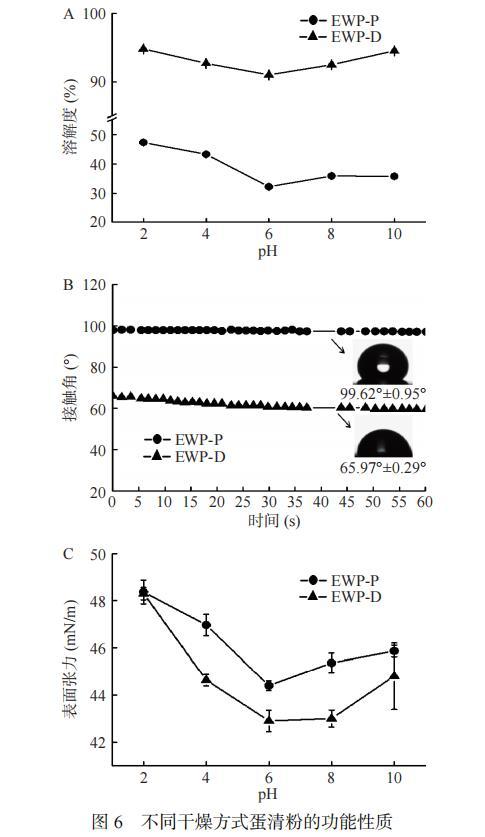溶解性是蛋白重要的功能特性之一,與接觸角、表面張力、乳化性等密切相關(guān)。如圖6A,不同pH下不同干燥方式的蛋清粉溶解度的測(cè)量。EWP-P的溶解度隨著pH的升高先減小后增大,這可能是因?yàn)樵谒嵝院蛪A性環(huán)境中球狀蛋白質(zhì)會(huì)發(fā)生部分展開,形成熔融球狀構(gòu)象,變得更加靈活,更容易與水分子作用。pH為6.0時(shí)蛋清蛋白的溶解度最低,可能是因?yàn)樵損H與蛋清蛋白中大部分蛋白的等電點(diǎn)相近,蛋白帶電荷量較少,因此容易發(fā)生沉淀。與EWP-P相比,EWP-D在pH6.0時(shí)溶解度的下降程度較小,這可能與真空冷凍干燥后蛋清蛋白的微觀結(jié)構(gòu)呈片狀,具有較大的比表面積有關(guān),也可能是因?yàn)槔鋬龈稍锏鞍踪|(zhì)在脫水過程中蛋白質(zhì)變性低,促進(jìn)了可溶性聚集物生成。EWP-D的溶解度遠(yuǎn)大于EWP-P,這是因?yàn)閲婌F干燥是直接將蛋清液霧化后再干燥,其蛋清粉表面會(huì)形成一個(gè)光滑、抗?jié)裥缘谋∧ぃ罱K導(dǎo)致蛋白的溶解性降低,復(fù)水性差且易結(jié)塊。而真空冷凍干燥經(jīng)過冷凍升華,可保持食品原有的形狀故具有很好的速溶性和復(fù)水性。Shaviklo等也發(fā)現(xiàn)噴霧干燥的含添加劑(花粉)蛋白的蛋白質(zhì)溶解度明顯低于凍干蛋白。