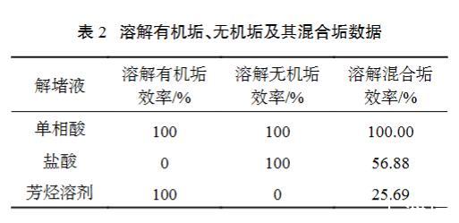 1.針對近井地帶存在的有機、無機及其混合垢傷害,開發了一種新型多功能解堵體系-單相酸體系。該單相酸體系由芳烴溶劑、酸液、表面活性劑、助表面活性劑及功能型添加劑組成。