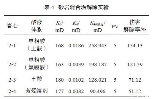 3.單相酸解堵后,巖心滲透率恢復率大于100%,表明單相酸體系不僅可以解除有機垢和無機垢傷害,還能酸蝕增滲,改善近井區域巖石滲流特性。