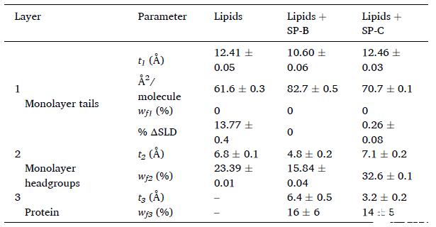圖5、從35 mN/m處的擬合獲得的結構參數分別表示每層的厚度和水體積分數。ΔSLD(%)表示擬合SLD與理論SLD值之間的百分比差。
