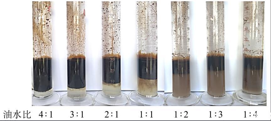 圖3為在45℃放置24 h后不同油水體積比條件下OBU-3低黏表面活性劑體系對油水的乳化情況。從圖3可看出,部分乳液分層嚴重,破乳效果較好。OBU-3對油水的乳化程度隨著油水體積比的增加而減小,油水體積比為4∶1、3∶1、2∶1、1∶1時分離出的水顏色較淺,油水分離效果較好。