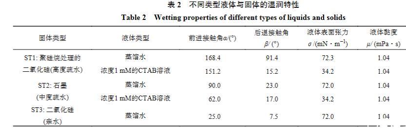 由于固、液兩相的表面特性會顯著影響固?液接觸角,從而影響液滴與顆粒的碰撞行為,筆者通過實(shí)驗(yàn)測量和文獻(xiàn)分析,對比了固、液特性的變化對接觸角的影響。表1列出了測量固、液特性時所使用的具體儀器及添加劑。表2給出了不同固體和液體樣品的接觸角、表面張力和黏度。其中高度疏水固體ST1與不同液體接觸角通過實(shí)測得出,中度疏水固體ST2和親水固體ST3的測量數(shù)據(jù)來自ZHU等的研究。對比后發(fā)現(xiàn),前進(jìn)接觸角α明顯大于后退接觸角β,所以在分析塵?霧濕潤特性時應(yīng)考慮前進(jìn)角和后退角的差異。