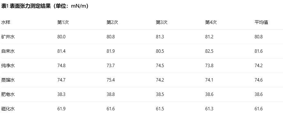 采用芬蘭Kibron公司生產的Delta-8全自動高通量表面張力儀對不同種類的水在室溫下進行測定,鉑金環浸入到水中一定的位置,隨著鉑金環與水之間的膜被拉長,使鉑金環受到一個向下的力,差動變壓器的磁芯隨鉑金環的下降而上升,使差動變壓器的線圈感應出一定的電壓值,這樣將被拉伸的薄膜變形量轉化為電壓量,經微機處理轉化為相應的張力值,并自動顯示出來。隨薄膜逐漸被拉長,張力值逐漸增大,直至薄膜破裂,記下的最大值即水的實時張力。