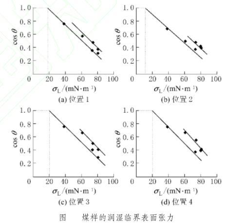 由圖2可知,煤樣不同位置處的臨界表面張力不同,按照式(3)計算得到位置1—4的臨界表面張力依次為:17.1、10.5、19.9、21.1 mN/m,分析其原因主要有2點:一是系統本身所具有的人為誤差的可能;二是測點位置煤樣表面粗糙度不同。因此,成莊礦煤樣的總體臨界表面張力取4個不同位置臨界表面張力值的算術平均值為17.15mN/m。因此,凡是表面張力低于17.15 mN/m的水都能以零度接觸角潤濕在成莊礦煤體表面上;表面張力大于17.15 mN/m的不同種類水,表面張力越逼近該值的,其對該煤樣的潤濕效果越好,越有利于煤層注水。