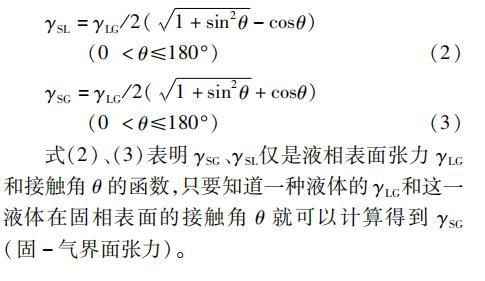 式(2)、(3)表明γSG、γSL僅是液相表面張力γLG和接觸角θ的函數,只要知道一種液體的γLG和這一液體在固相表面的接觸角θ就可以計算得到γSG(固-氣界面張力)。