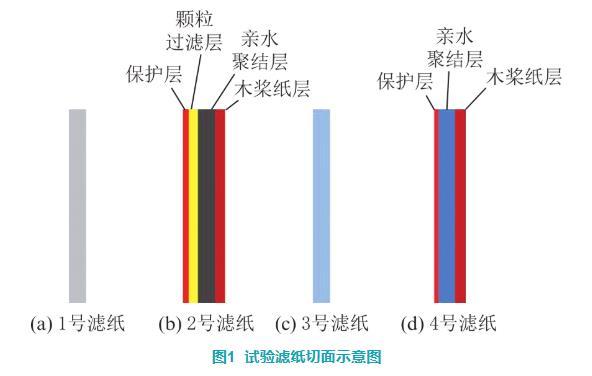 濾紙的切面結(jié)構如圖1所示。1號濾紙為單層親水材料。2號濾紙由保護層a、顆粒過濾層b、親水聚結(jié)層c和木漿紙層d組成,木漿紙作為基層材料,c和d層、b與c層均由樹脂粘結(jié),a與b層通過超聲波焊接在一起。3號濾紙為聚四氟乙烯編織而成的單層網(wǎng)狀濾紙。4號濾紙由保護層a、疏水過濾層b和基層c組成,4號濾紙的粘結(jié)工藝與2號濾紙相同,保護層和疏水層由超聲波焊接在一起,基層和疏水層使用樹脂進行粘結(jié)。