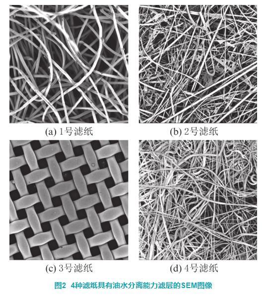 使用Phonem Pro X掃描電子顯微鏡(scanning electron microscope,SEM)在500倍放大倍率下拍攝的4種濾紙的微觀結(jié)構如圖2所示。1號濾紙由直徑約為15μm的親水纖維構成;2號濾紙的親水層由粗細不同的纖維通過樹脂粘接而成,其中粗纖維還起到增加親水層物理強度的作用;3號濾紙由直徑約為45μm的聚四氟乙烯纖維絲編制,兩根纖維之間的距離約為44μm;4號濾紙的b層由疏水材料通過熔噴工藝制成,在平面上纖維分布疏密不均但在空間內(nèi)有著較好的孔隙分布。除了3號濾紙外,其余濾紙均具有油水分離層,同時也具有較為復雜的空間結(jié)構。