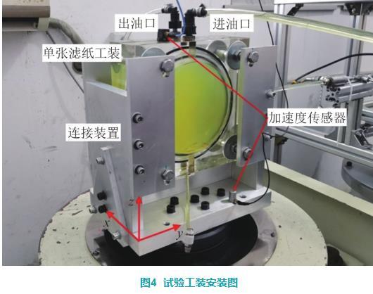 單張濾紙工裝由兩塊50 mm厚的有機玻璃制成,在頂部加工進出油口,在底部加工放水口。單張濾紙工裝和振動試驗臺通過一個特制的鋁質(zhì)底座進行連接,如圖4所示。