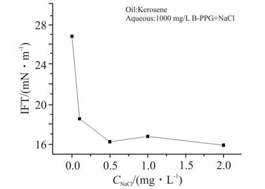 礦化度是影響化學驅配方效果的關鍵因素之一。B-PPG分子中的酰胺基團在水中可部分水解產生負電荷,因此,其界面性能也會受到礦化度的影響。1000mg/L既是B-PPG的CAC,也是現場配方的使用濃度,因此,在此濃度下考察了礦化度對B-PPG界面膜性質的影響。不同濃度的NaCl對1000 mg/L B-PPG界面張力的影響見Fig.3。可以看出,NaCl的加入可以明顯降低B-PPG體系的界面張力。隨著NaCl濃度的增加,界面張力下降程度放緩;當NaCl濃度高于0.5%時,界面張力不再變化。這是電解質壓縮B-PPG界面膜的雙電層,減弱了靜電斥力,從而增大了B-PPG的吸附量造成的。