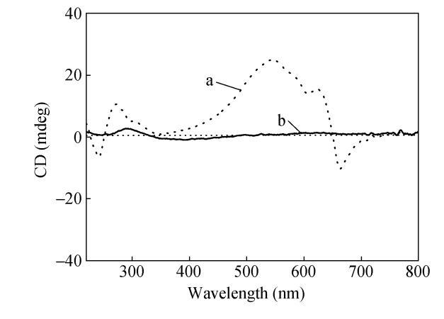 香豆素基團在紫外光照條件下可發生可逆的光二聚反應:在365nm光輻照下,香豆素基團能發生光二聚反應,在254nm輻照下香豆素二聚體能可逆地發生解二聚反應??梢灶A見香豆素端基的二聚化將影響香豆素取代二乙炔單體在氣液界面的組裝,從而影響聚二乙炔主鏈螺旋結構的形成。我們用365nm紫外燈輻照CODA氯仿溶液20min,此時香豆素端基能發生二聚,而二乙炔基團不會發生聚合。將得到的CODA二聚體的氯仿溶液鋪展在水面上,沉積制備LB膜,制備得到的CODA二聚體LB膜能聚合成藍相。CD光譜測試發現香豆素基團和相應的聚二乙炔吸收帶均出現了明顯的CD信號,但強度較CODA LB膜均有所減弱,如圖8所示。