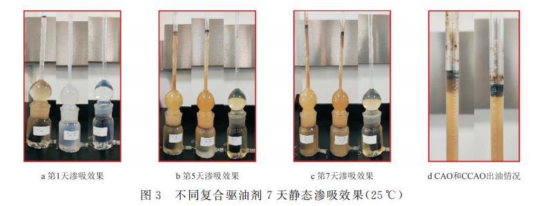 將巖心在110℃下烘干,稱重;將飽和好油的巖心置于阿莫特密封瓶(Amott cell瓶)中,分別加入試樣溶液(CAO、CCAO或FHQ-I的標(biāo)準(zhǔn)溶液)至略超過Amott cell瓶的最低刻度處,在25℃環(huán)境中,觀察并記錄其出油體積,通過計算得到的結(jié)果見表5,同時觀察不同時間飽和巖心滲吸出的原油形態(tài)(如圖3所示)。