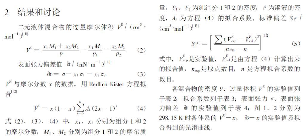式 (2)、 (3)、 (4)中, x1、 x2分別為組分1 和2的摩爾分數, M1、 M2分別為組分1 和2 的摩爾質量, ρ1、 ρ2為純組分1 和2 的密度, ρ為溶液的密度, Ai為方程 (4)的擬合系數。標準偏差 SVE(cm3·mol-1)[ 13]