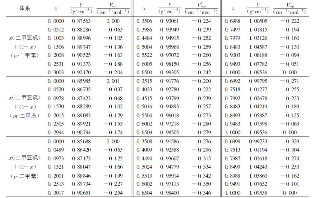 | 體系 | x(二甲亞砜)+(1-x)(o-二甲苯) | x(二甲亞砜)+(1-x)(m-二甲苯) | x(二甲亞砜)+(1-x)(p-二甲苯) | ||||||